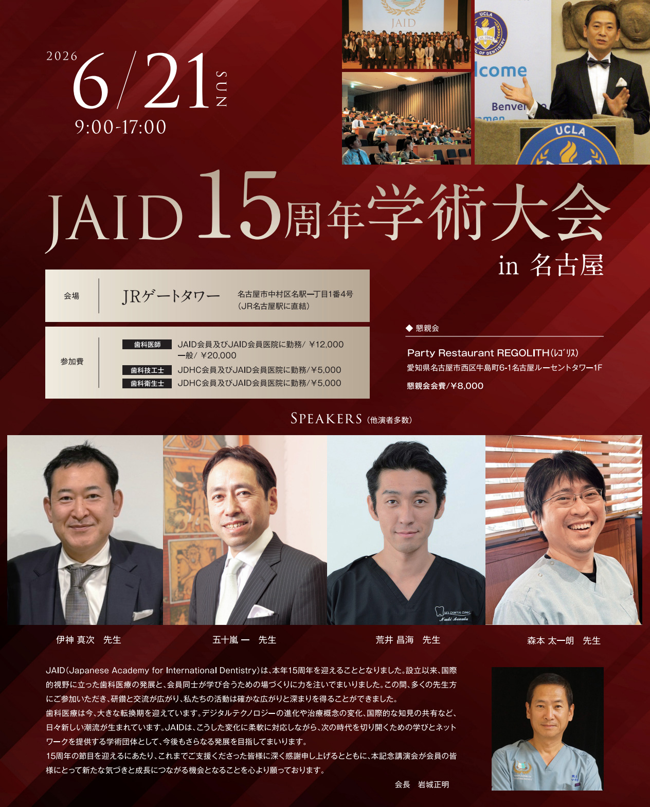 JAID(Japanese Academy for International Dentistry)は、本年15周年を迎えることとなりました。設立以来、国際的視野に立った歯科医療の発展と、会員同士が学び合うための場づくりに力を注いでまいりました。この間、多くの先生方にご参加いただき、研鑽と交流が広がり、私たちの活動は確かな広がりと深まりを得ることができました。